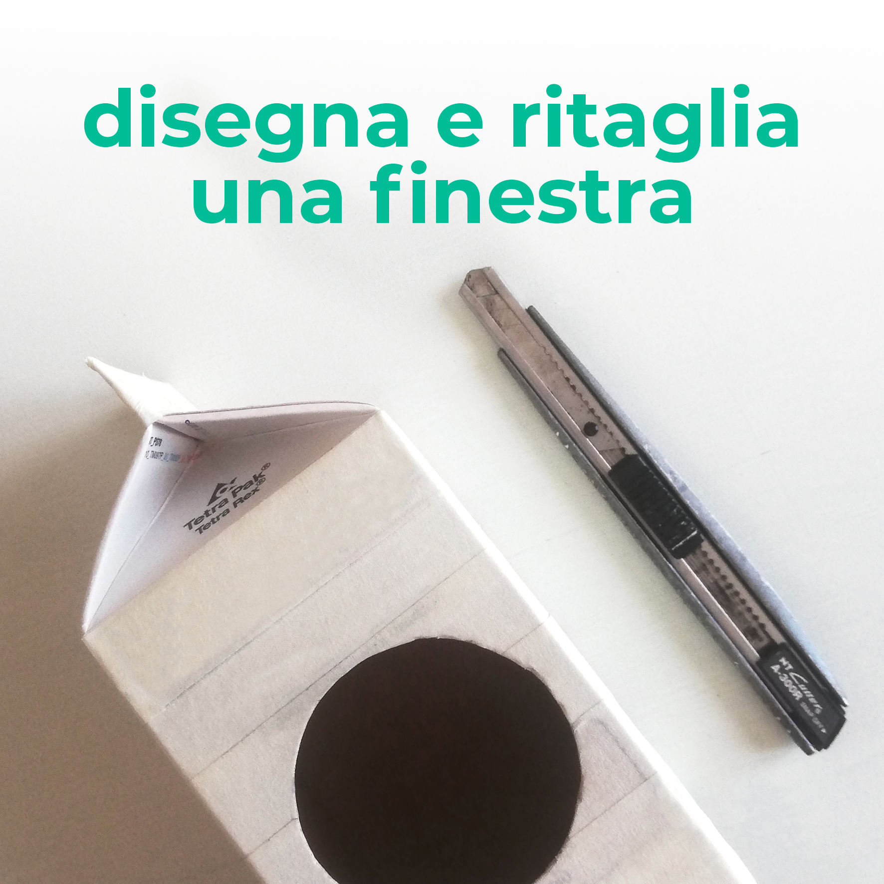 1. Lava bene il cartone del latte e chiudi i beccucci fissandoli con un po’ di colla. Poi, disegna e ritaglia l’ingresso della casetta: noi abbiamo disegnato una finestra circolare, ma puoi farne una rettangolare aiutandoti con un righello.