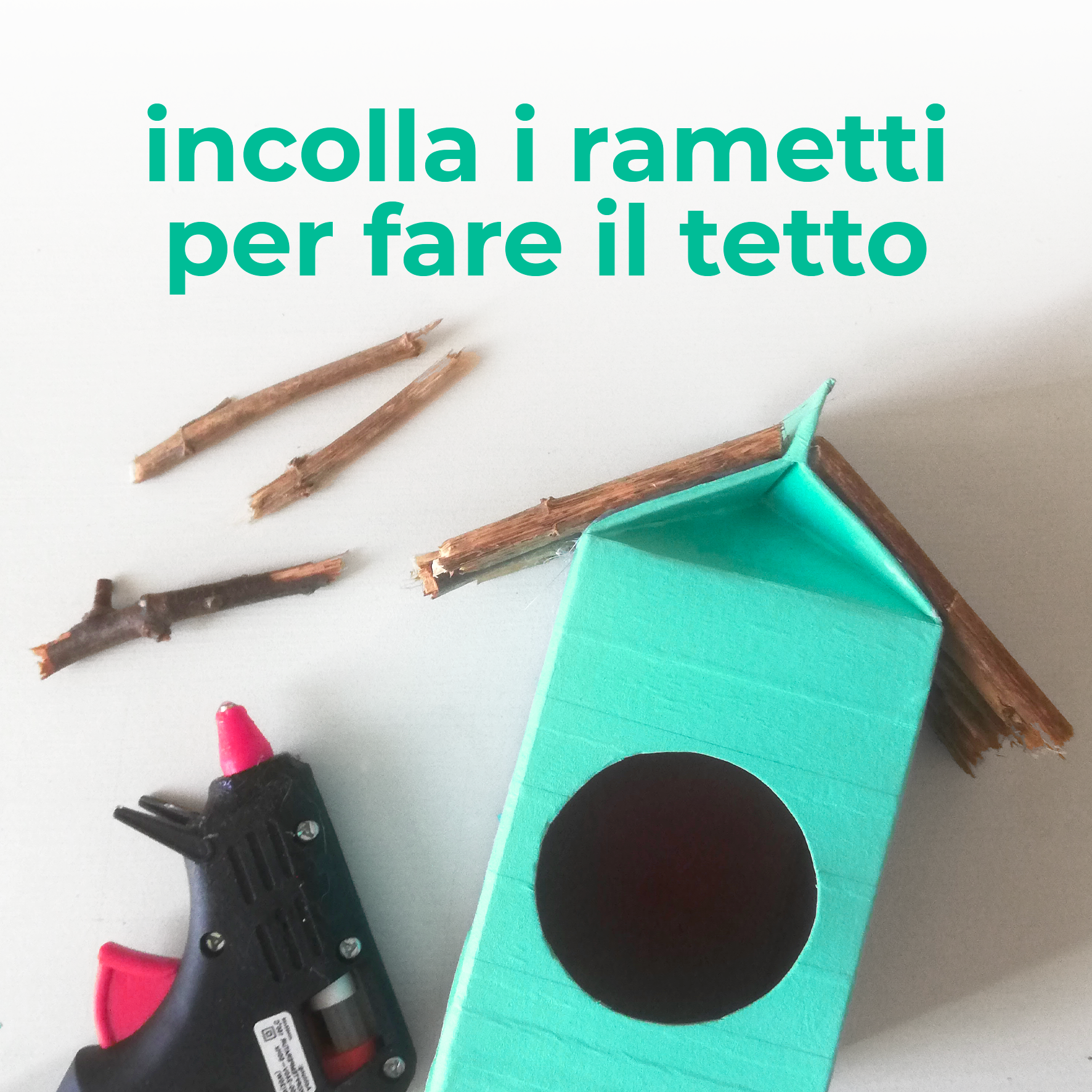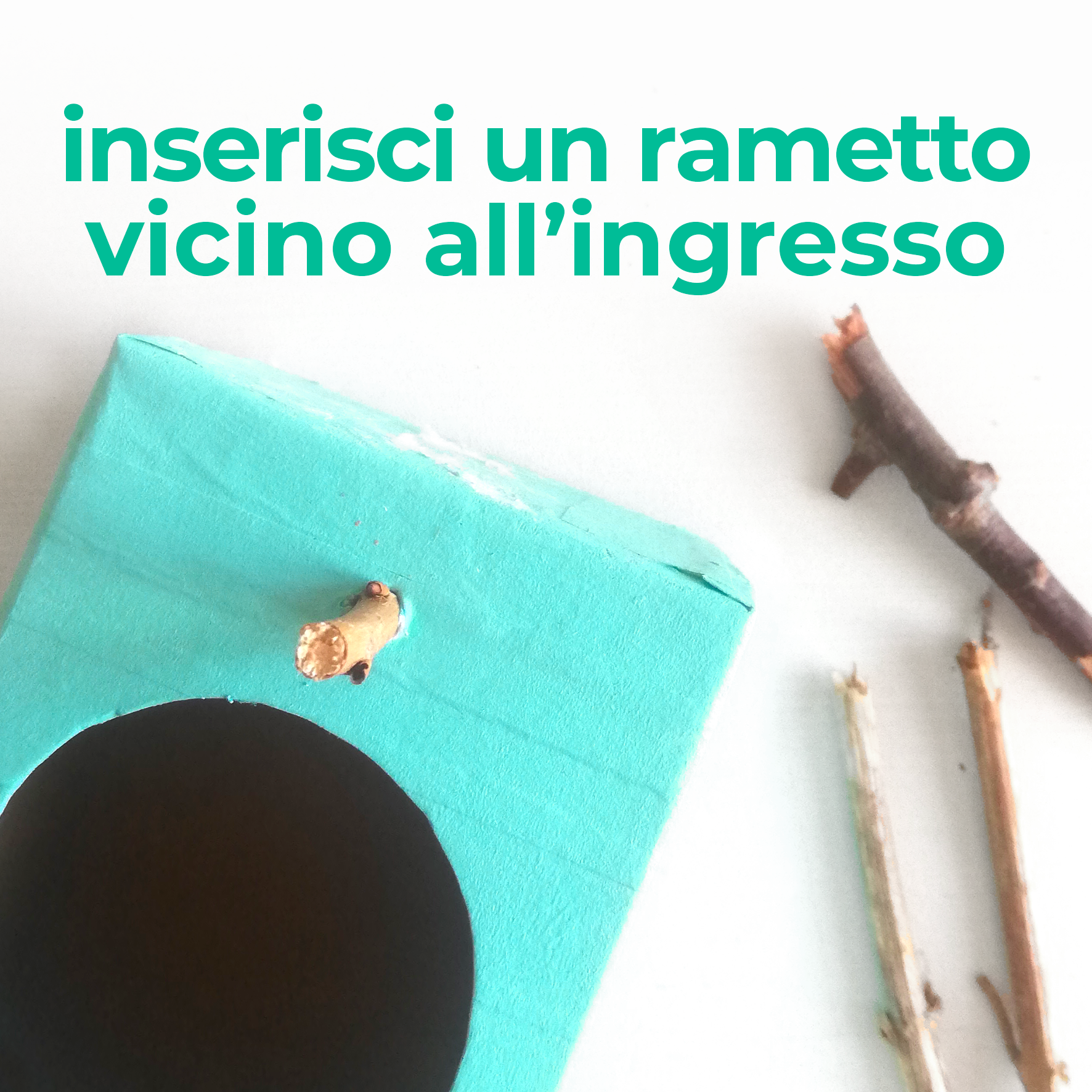 4. Con la punta di una matita ben temperata, fai un buco sotto l’ingresso della casetta, inserisci un rametto e fissalo con la colla. Servirà agli uccellini per appoggiarsi!