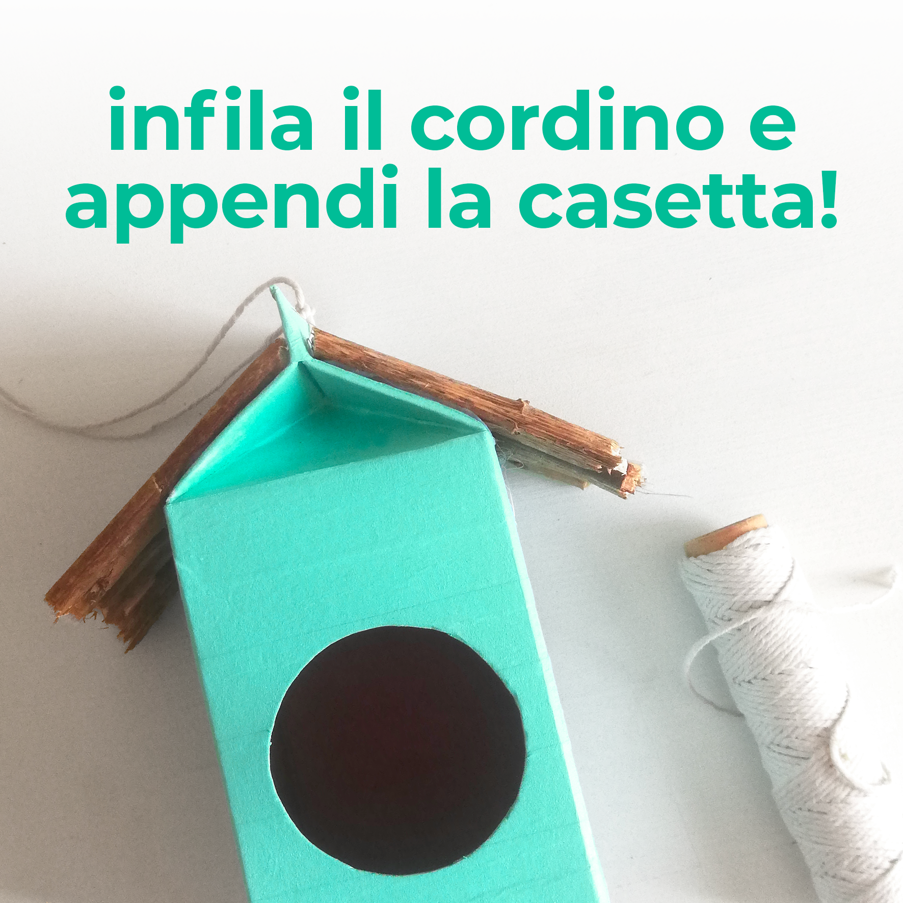 5. Fai un buco sulla chiusura del brick (la parte che hai incollato prima), inserisci un cordino e fissalo facendo un nodo. Ora la casetta è pronta per essere appesa!