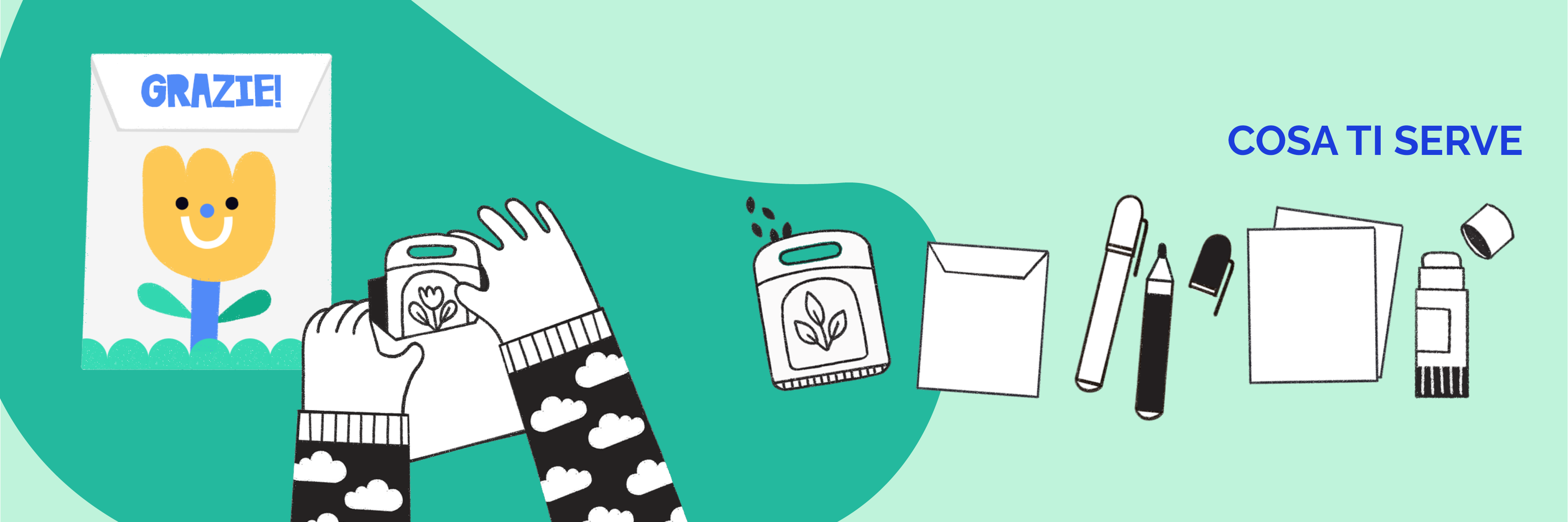 una bustina di semi di fiori per ogni invitato, una busta bianca poco più grande, pennarelli colorati e/o cartoncini di diversi colori, colla stick