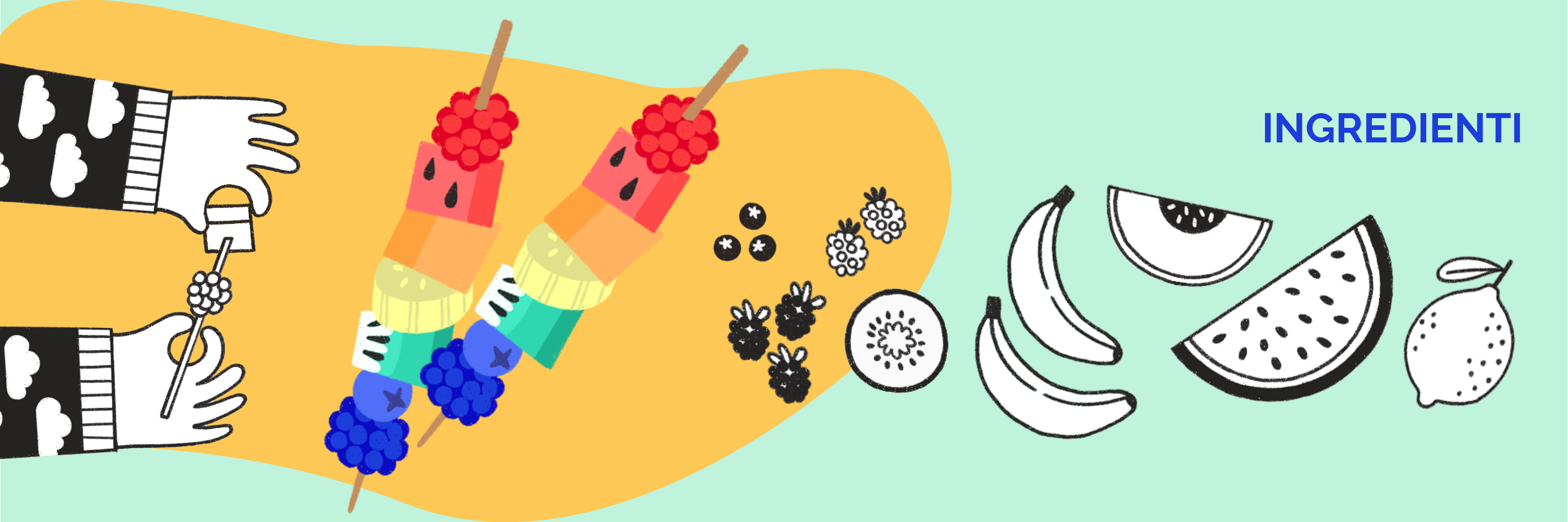 - Per comporre i tuoi spiedini infila in sequenza lampone, anguria, melone, banana, kiwi, mirtillo e mora, poi spennella ogni spiedino con poco succo di limone e … sono pronti!