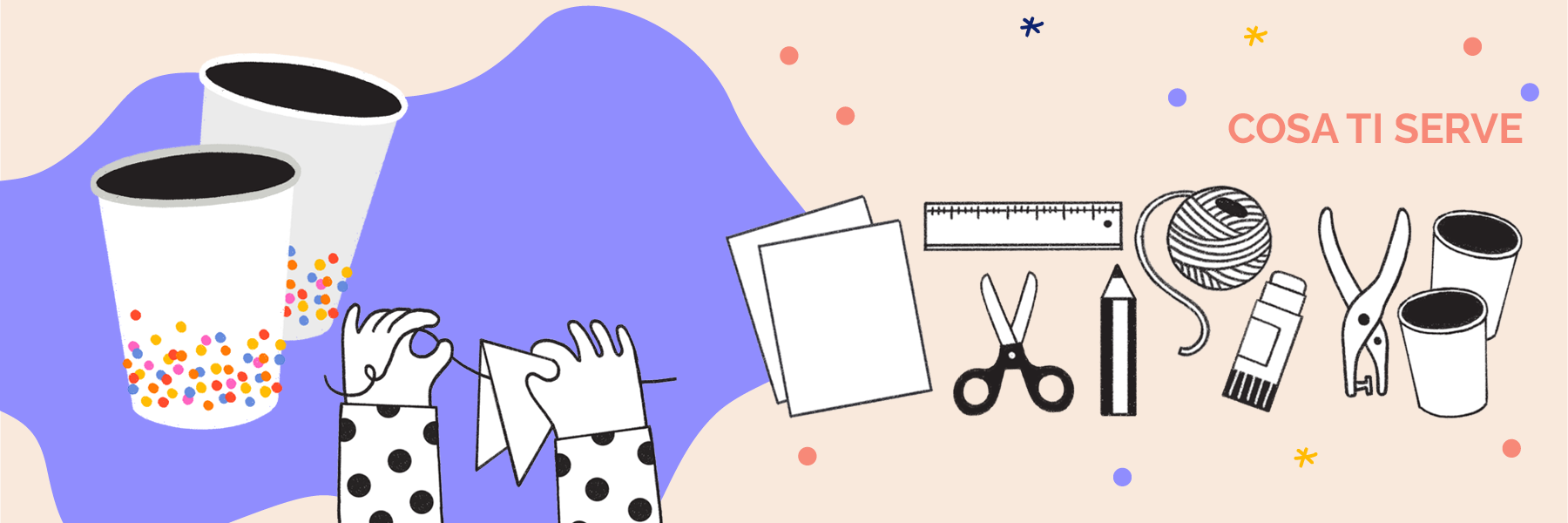 cartoncini colorati, righello, matita, forbici, filo o cordino colorato, colla, foratrice per fogli, bicchieri di carta