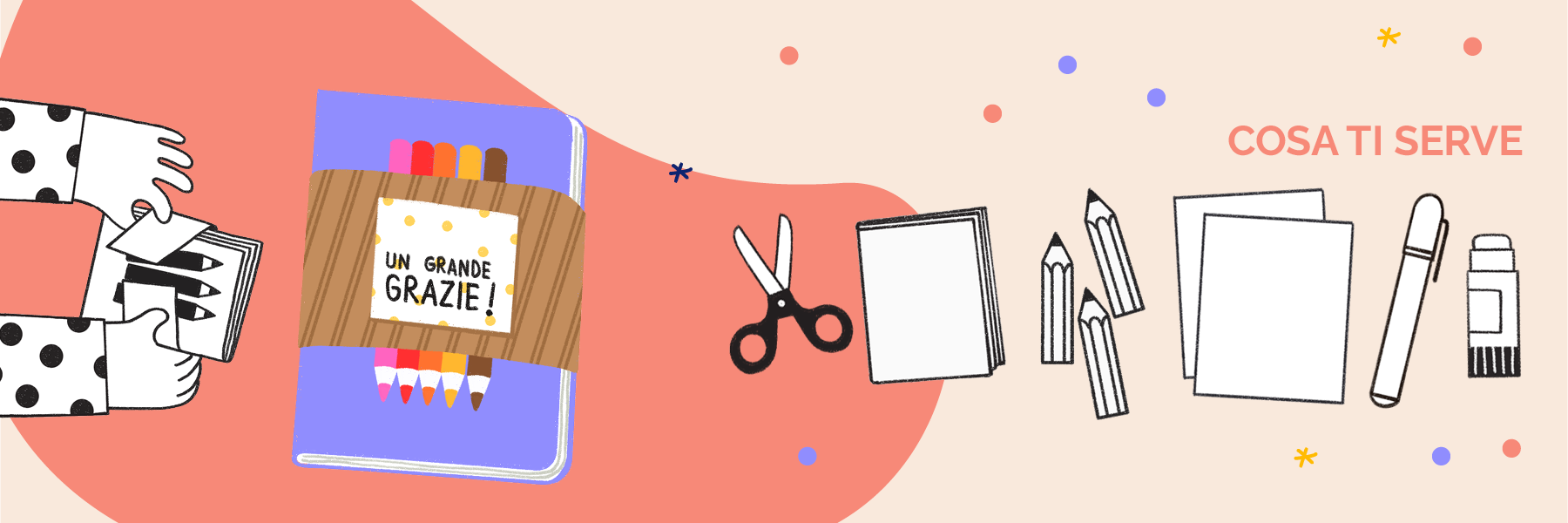 forbici, un piccolo quadernino per ogni invitata/o, 4-5 piccole matite colorate per ogni invitata/o, cartoncini colorati, pennarello, colla o nastro biadesivo