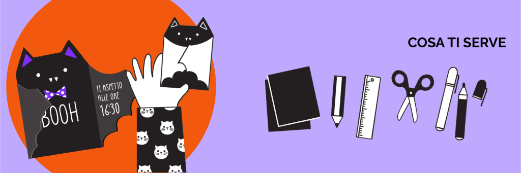 cartoncini neri, matita, righello, forbici, pennarelli bianco e viola
