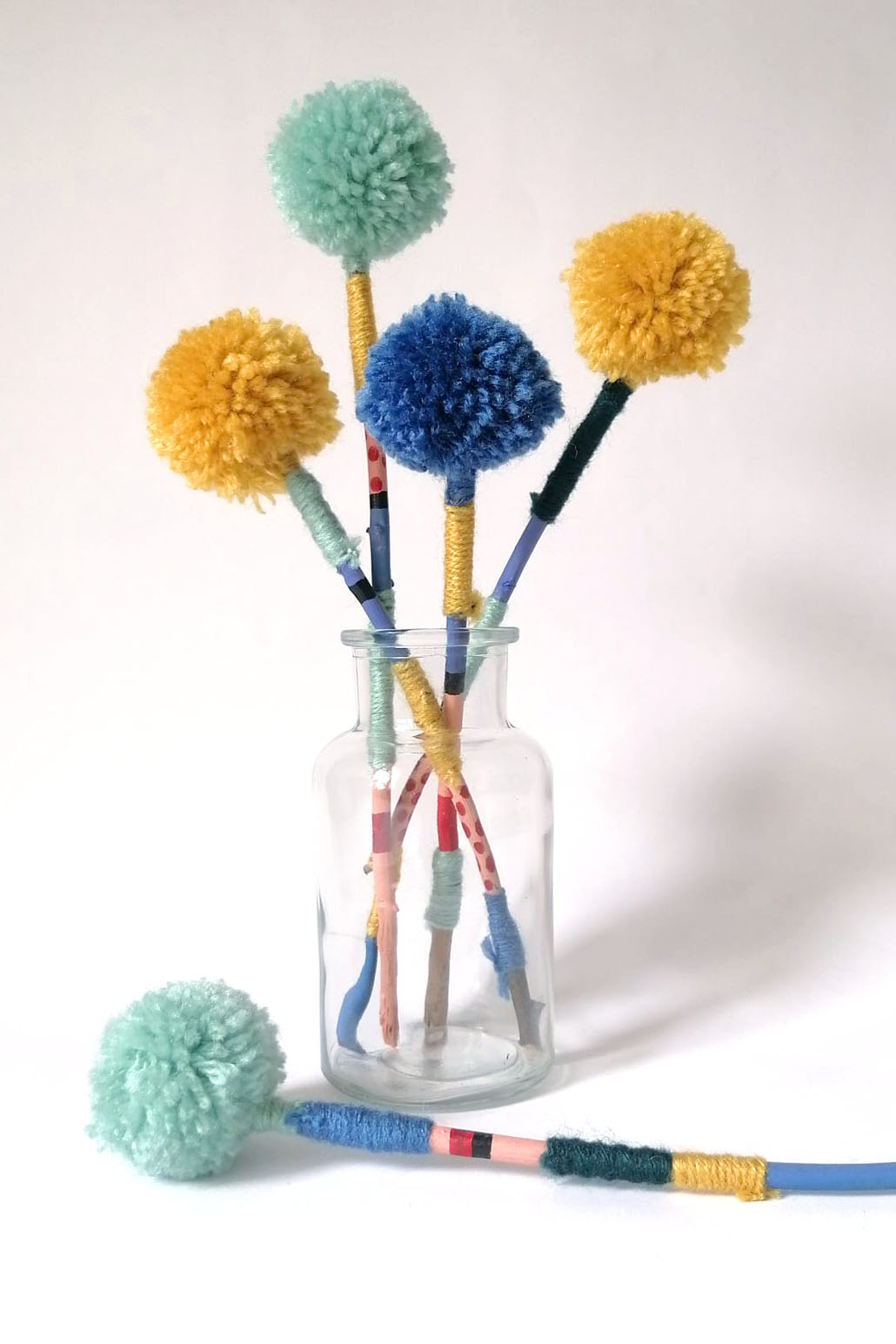 Fissa i pompon sulle sommità dei ramoscelli con la colla vinilica o, se preferisci, con la colla a caldo. Ed ecco che i fiori personalizzati sono pronti per la tua mamma!