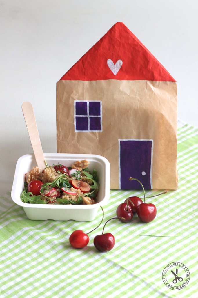 3. Prepara i tuoi kit da pic-nic: per ogni persona ti serviranno una ciotolina o un piatto, un bicchiere, posate e tovagliolo! Componi il tutto e inserisci all’interno del sacchetto, piega gli angoli sul retro e fissali con un pezzetto di nastro adesivo di carta!