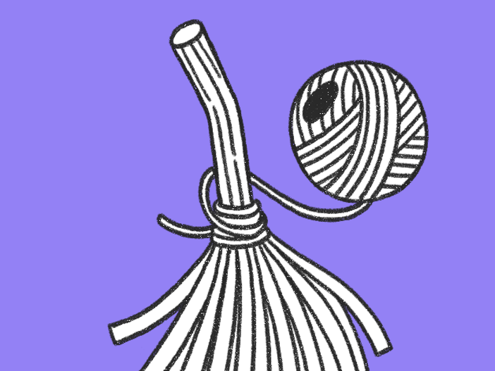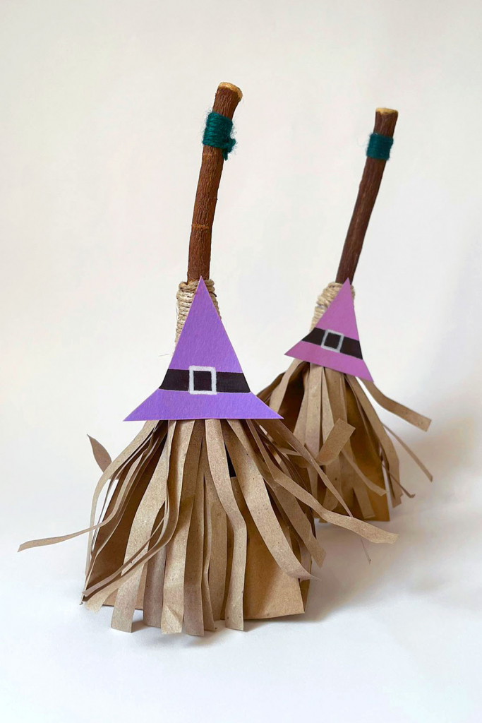 Avvolgi del nastro colorato attorno ai manici e, con un pezzetto di nastro adesivo, fissa i cappelli sulle scope. Le tue scopine portafortuna sono pronte!