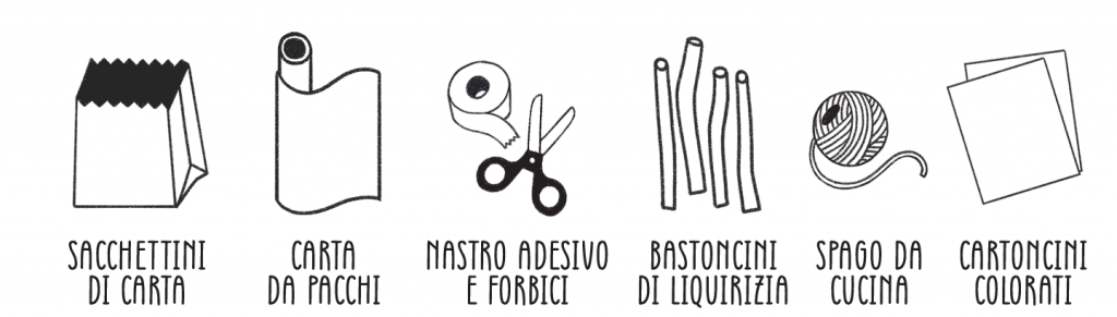 Inserisci i bastoncini di liquirizia, o dei rametti raccolti durante una passeggiata, poi chiudi i sacchetti con il nastro adesivo.