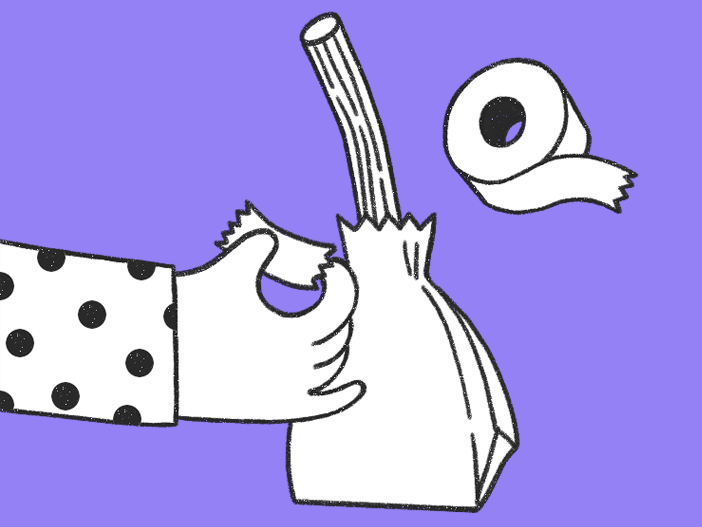 Taglia a misura la carta da pacchi in maniera che copra ogni sacchetto, poi taglia le frange facendo attenzione a fermarti a 3-4 cm dal bordo. In alternativa alla carta da pacchi puoi usare ritagli di carta da regalo o di tessuti che trovi in casa!