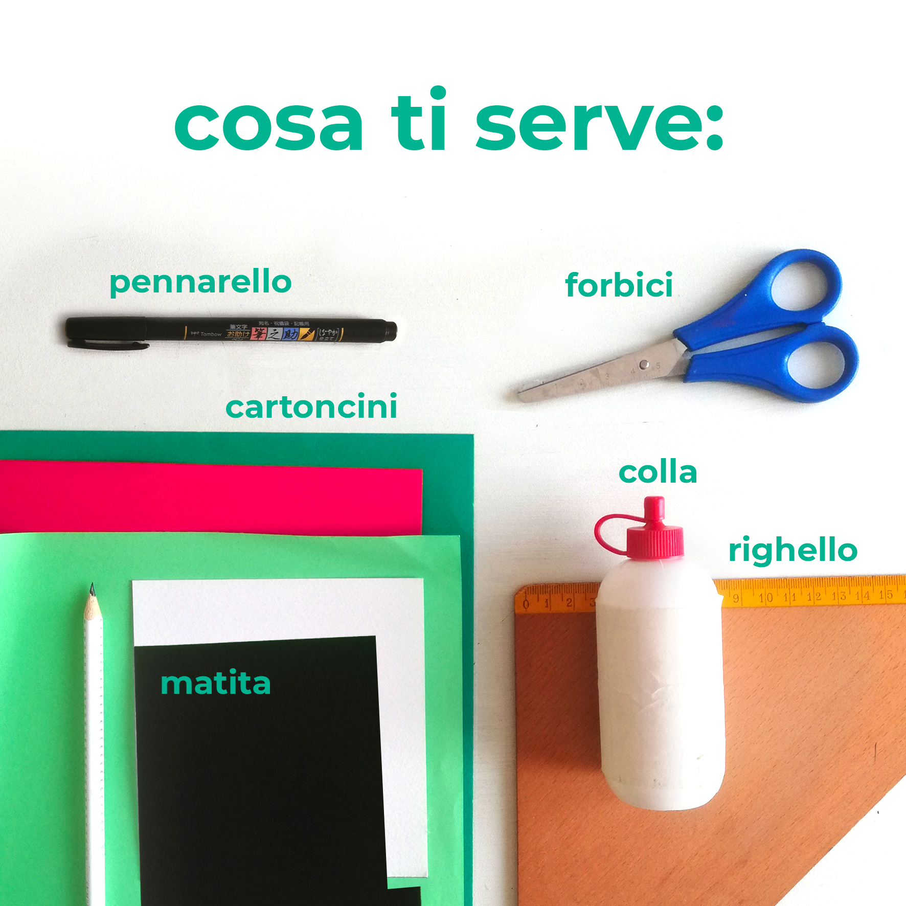 cartoncini colorati, forbici, colla stick, matita, pennarello, righello o squadra.