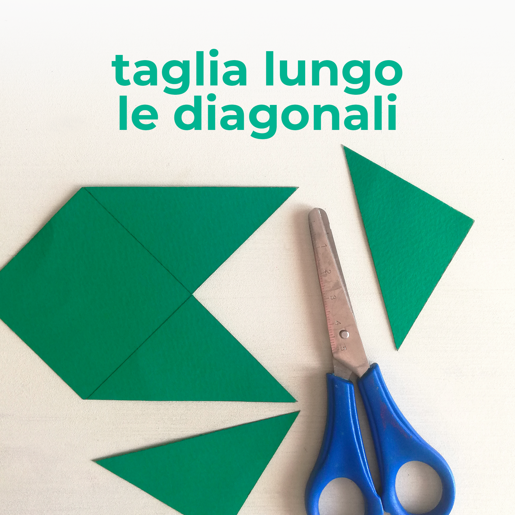2. Disegna le diagonali dei quadrati laterali, poi ritaglia la forma come indicato.