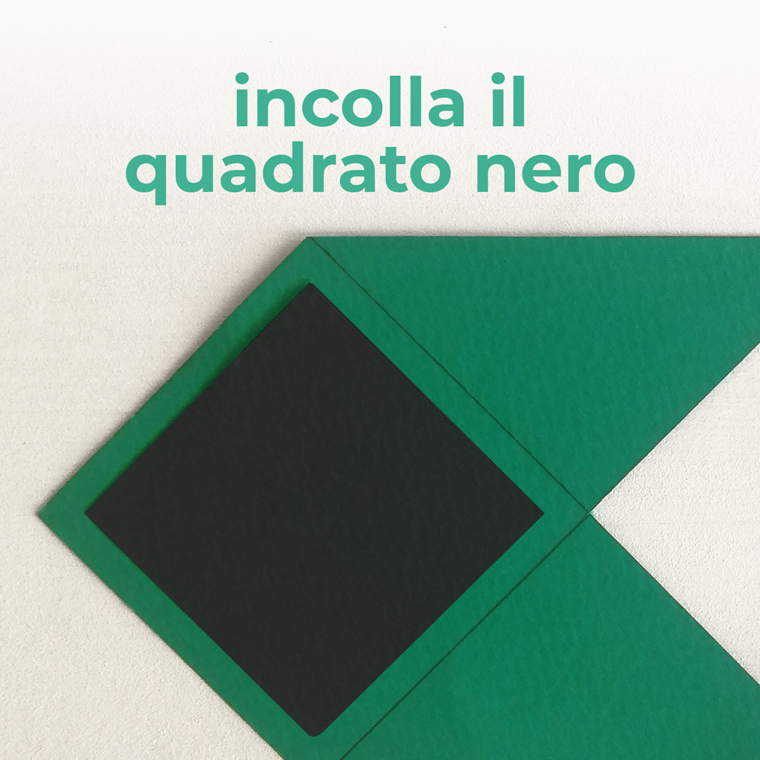 3. Disegna e ritaglia un quadrato di 5×5 cm dal cartoncino nero, poi incollalo al centro del quadrato colorato.