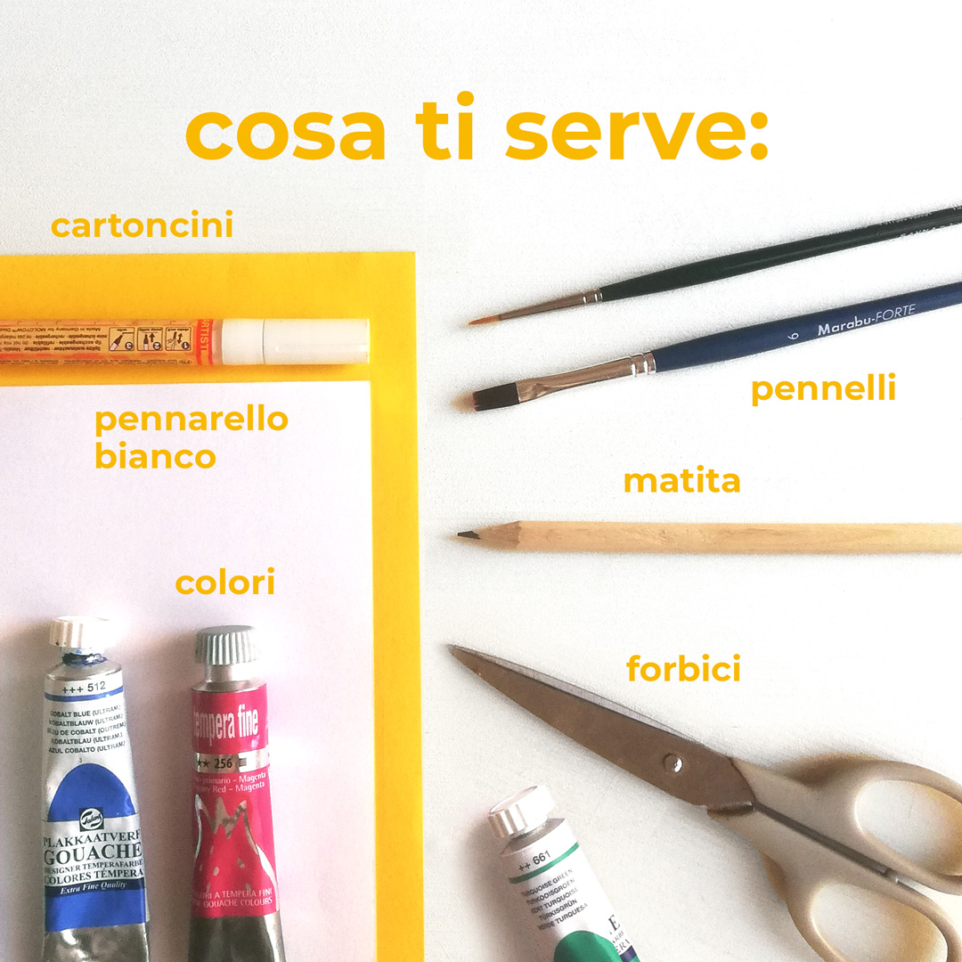 cartoncino colorato, cartoncino bianco, colori acrilici o tempere, pennelli, matita, forbici, pennarello bianco.
