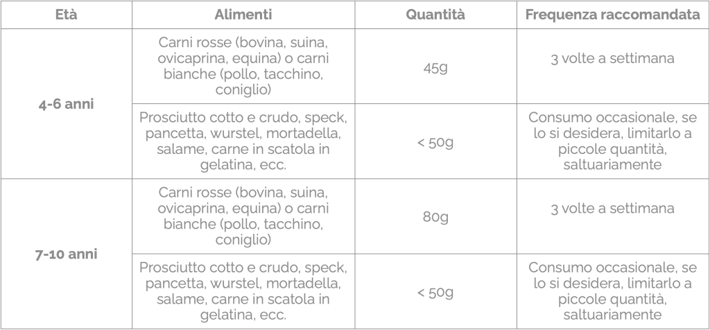 Per il bambino, come per l’adulto, si dovrebbe preferire il consumo di carni bianche rispetto alle rosse. Le prime infatti contengono meno grassi saturi e colesterolo ma sono ugualmente una buona fonte di proteine e di altri importanti nutrienti, quali ferro e vitamina B12. Il consumo di carni trasformate o conservate andrebbe invece molto limitato per il contenuto generalmente elevato di sale, di grassi (soprattutto negli insaccati) e per la presenza di additivi come nitrati e nitriti.