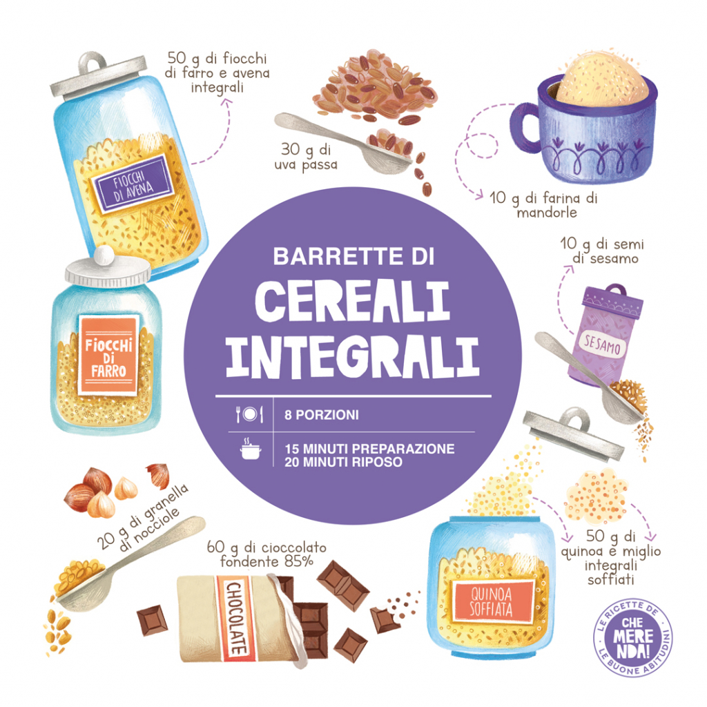 Quattro tipi di cereali integrali, cioccolato fondente e frutta a guscio per una merenda sana, golosa e super energetica. I bambini (e non solo) ne andranno matti! Provare per credere.