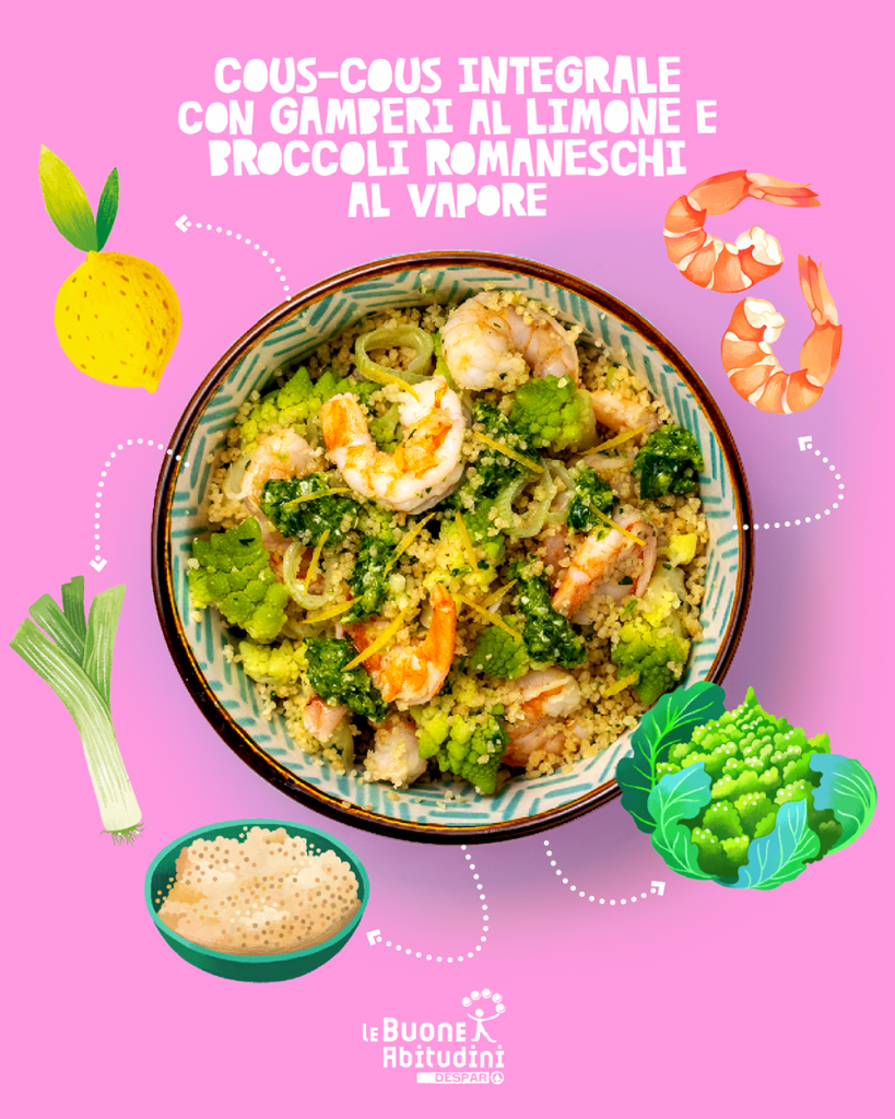 Passate le feste ecco una ricetta equilibrata, gustosa e leggera, in cui sono rispettate tutte le proporzioni del Piatto Unico: 50% di verdure (broccolo romanesco), 25% di fonti di carboidrati complessi (cous-cous integrale), 25% di fonti proteiche (gamberetti) e, per concludere, i grassi buoni (olio extra vergine di oliva e pinoli).