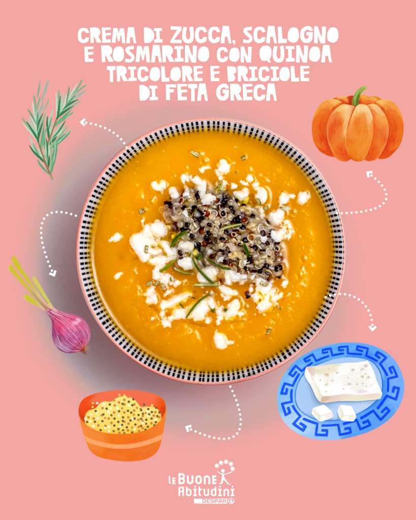 Cuocere e frullare la zucca rende questi composti (che si trovano racchiusi nelle cellule vegetali) altamente disponibili per il nostro organismo. Le pareti cellulari, infatti, ammorbidite dalla cottura e poi rotte con il frullatore, permettono ai carotenoidi di essere assorbiti e utilizzati facilmente dal corpo. In questa ricetta, inoltre, la presenza di grassi provenienti dall’olio extravergine di oliva e dalla feta ne migliora ulteriormente l’assorbimento, poiché i carotenoidi sono liposolubili.