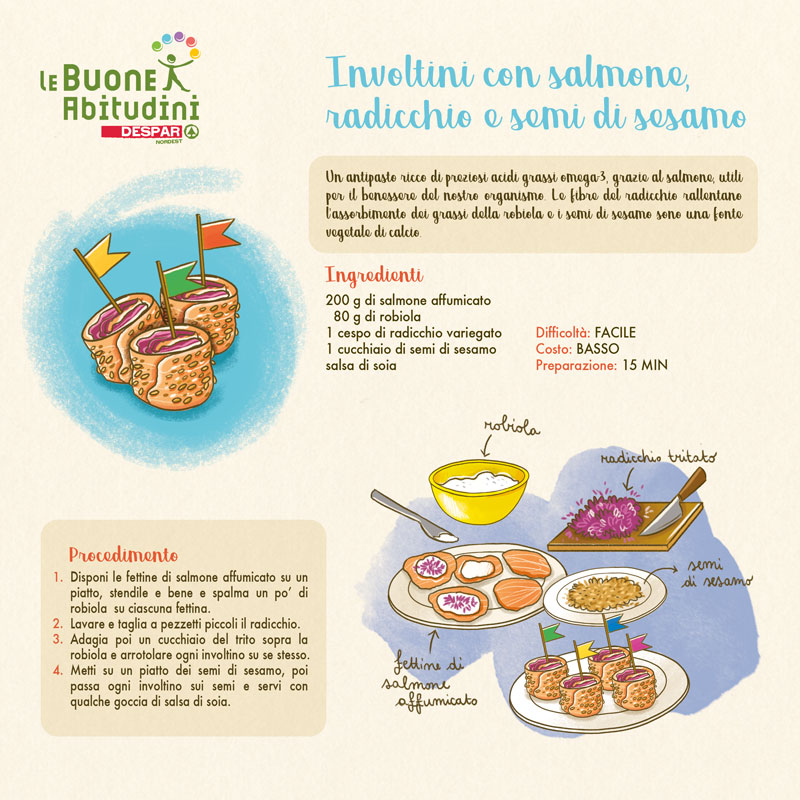 Un antipasto ricco di preziosi acidi grassi omega-3, grazie al salmone, utili per il benessere del nostro organismo. Le fibre del radicchio rallentano l’assorbimento dei grassi della robiola e i semi di sesamo sono una fonte vegetale di calcio.