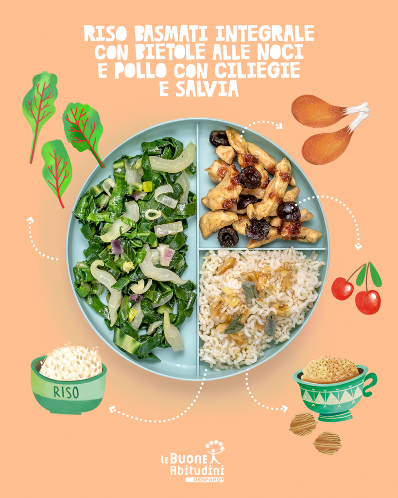 Bietola e ciliegie coprono il 50% del nostro piatto, i carboidrati complessi sono assicurati dal riso basmati integrale, mentre il pollo rappresenta la nostra fonte di proteine e, facendo parte della carne bianca insieme a tacchino e coniglio, se ne suggerisce il consumo di 2 porzioni la settimana (1 porzione = 100g).