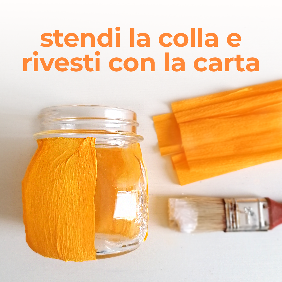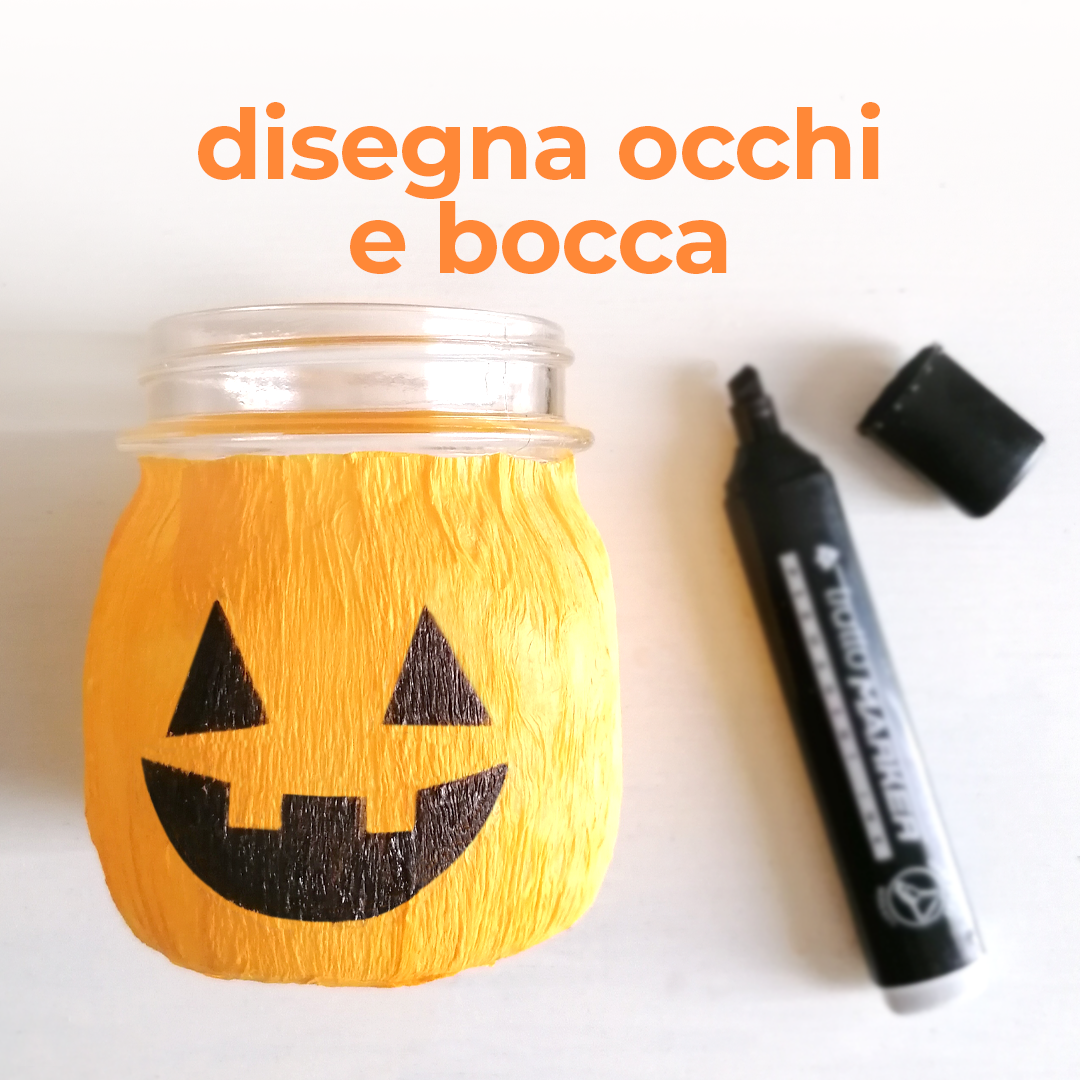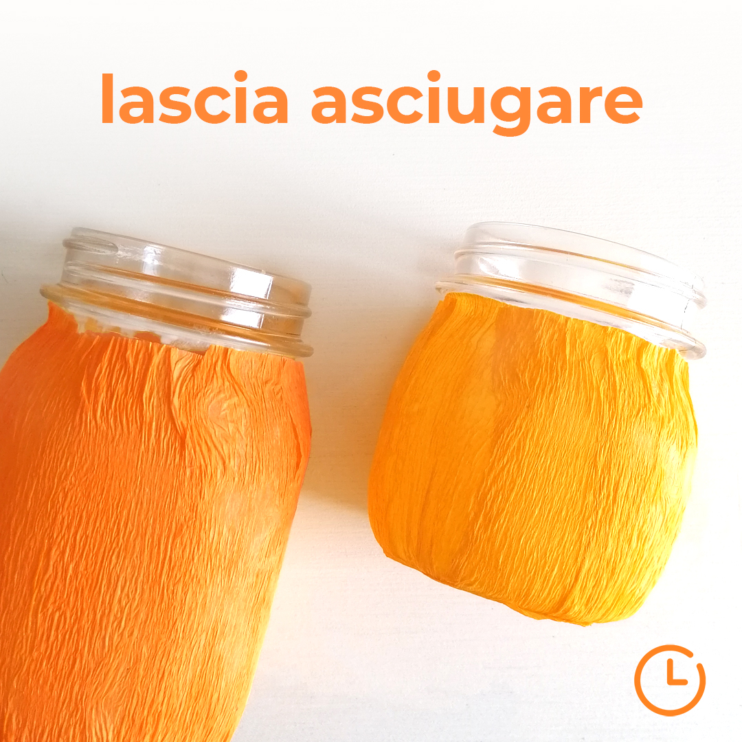 Barattoli in vetro (di diverse forme e dimensioni), carta crespa arancione, colla vinilica, forbici, pennello di medie dimensioni, pennarelli neri indelebili. Facoltativo: candele, filo di lana.
